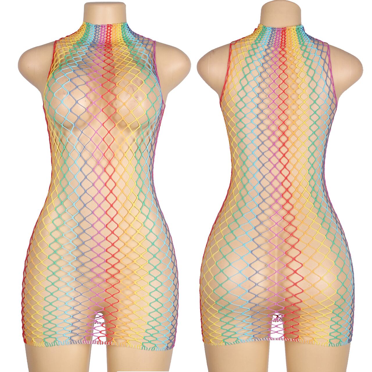 レインボーカラー 網目が大きいネットのハイネックドレス